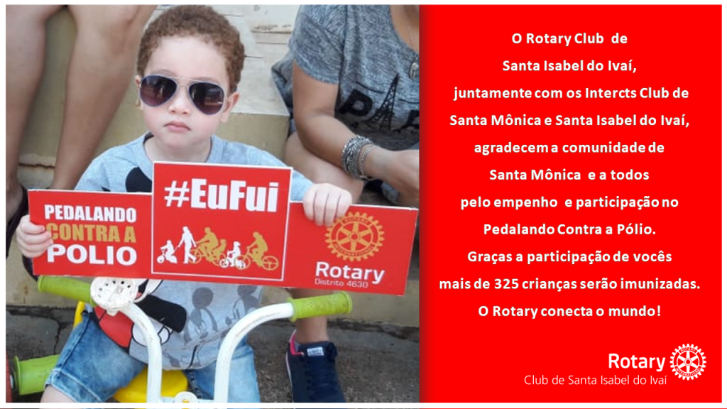 Um evento de suma importância que promoveu a conscientização da comunidade de um modo geral e também arrecadou fundos para aquisição da vacina. O Rotary Club de Santa Isabel do Ivaí, juntamente com os Interact Club de Santa Mônica e Santa Isabel do Ivaí, agradecem a todos envolvidos no evento e, de um modo especial as EMPRESAS DE CIDADÃS, como também informa que graças a mobilização, mais de 325 crianças terão acesso a imunização.
